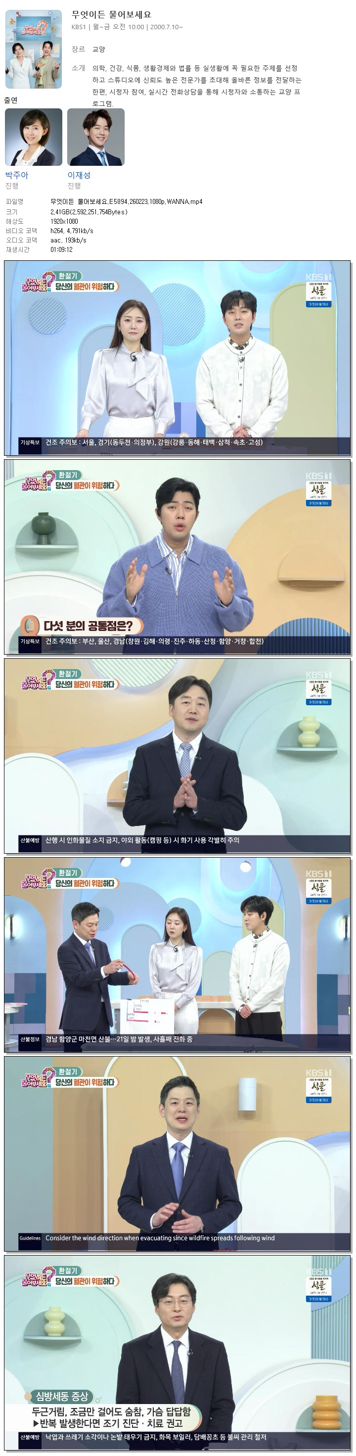 | [KBS1] 무엇이든 물어보세요.E5894.260223.1080p.WANNA[박주아, 이재성].mp4 | 2.4 G | 01:09:12 | 1920x1080 |