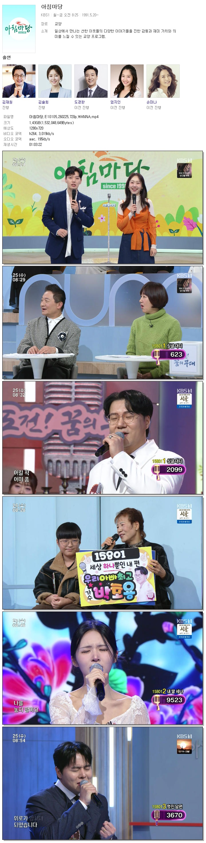 | [KBS1] 아침마당.E10105.260225.720p.WANNA[김재원, 엄지인].mp4 | 1.4 G | 01:03:22 | 1280x720 |