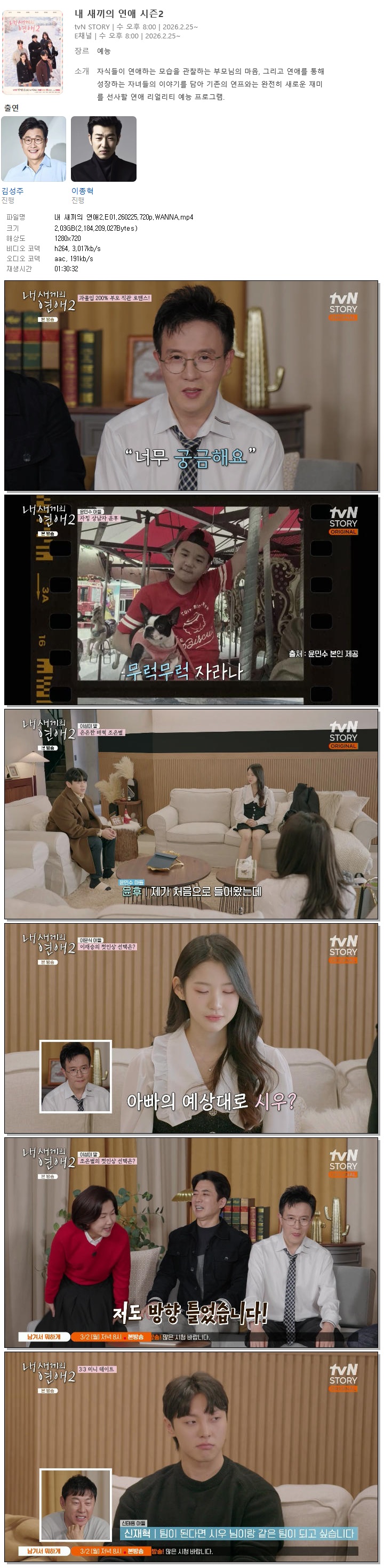 [TVN STORY] 내 새끼의 연애2.E01.260225.720p.WANNA[윤민수, 이종혁].mp4 2 G 01:30:32 1280x720