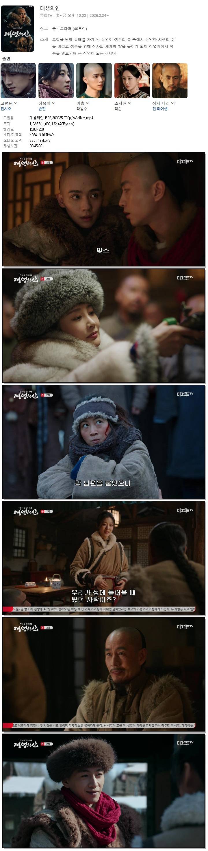 [중화TV] 대생의인.E02.260225.720p.WANNA[천샤오, 손천].mp4 1 G 00:45:09 1280x720