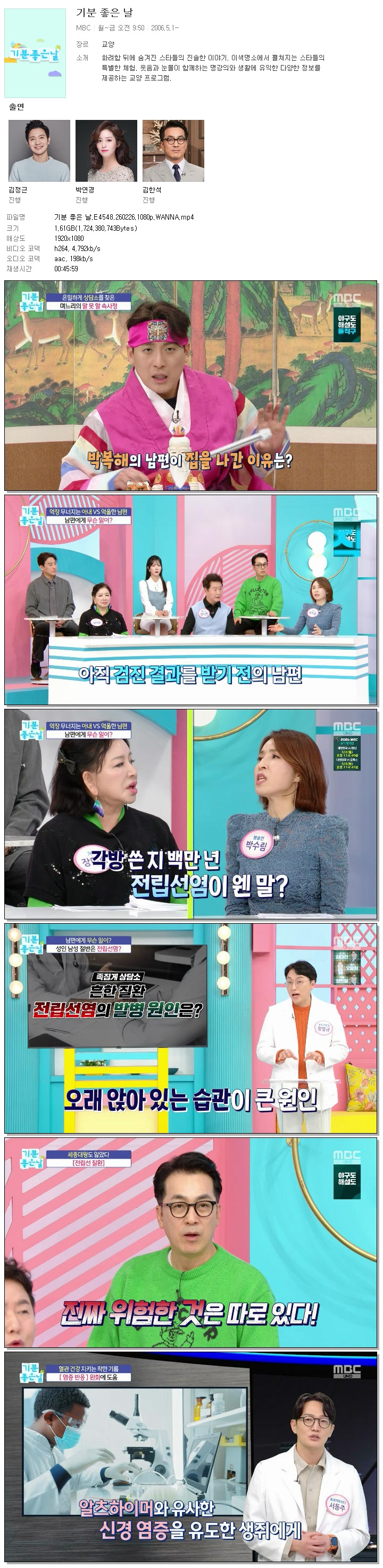 ■ 영원한 트로트의 황제 송대관도 끝내 넘지 못한 암 가족과도 같았던 태진아가 생각하는 송대관의 담도암 발병 원인은? 기분 좋은 날 본방 사수하세요! ■ 가족 암 간병을 둘러싼 가족 갈등 아픈 부모 간병하는 아들은 단 20명 중 1명! 간병하는 가족 대부분이 여성일 수밖에 없는 주요 원인은? 기분 좋은 날에서 함께 하세요 ■ 노년 건강을 무너뜨리는 암 가족의 삶도 예외는 아니다! 재연 드라마로 보는 암 투병 중에도 이어진 시댁의 막말로 이혼 결심 암 보험금 재산 분할 된다? 안 된다? 기분 좋은 날에서 놓치지 마세요! ■ 수술로 끝나지 않는 암 환자의 걱정 막대한 치료비 부담까지 이어진다! 암 환자가 꼭 알아야 할 지원 제도와 놓치지 말아야 할 암의 전조 증상은? 기분 좋은 날에서 알려드립니다 ■ 영양 전달과 노폐물 배출 저하는 각종 바이러스 감염의 원인이다?! 영양소를 전신으로 운반하는 <알부민> 알부민이 혈관 건강에 도움 되는 이유와 섭취법까지 기분 좋은 날에서 해결해 드립니다!