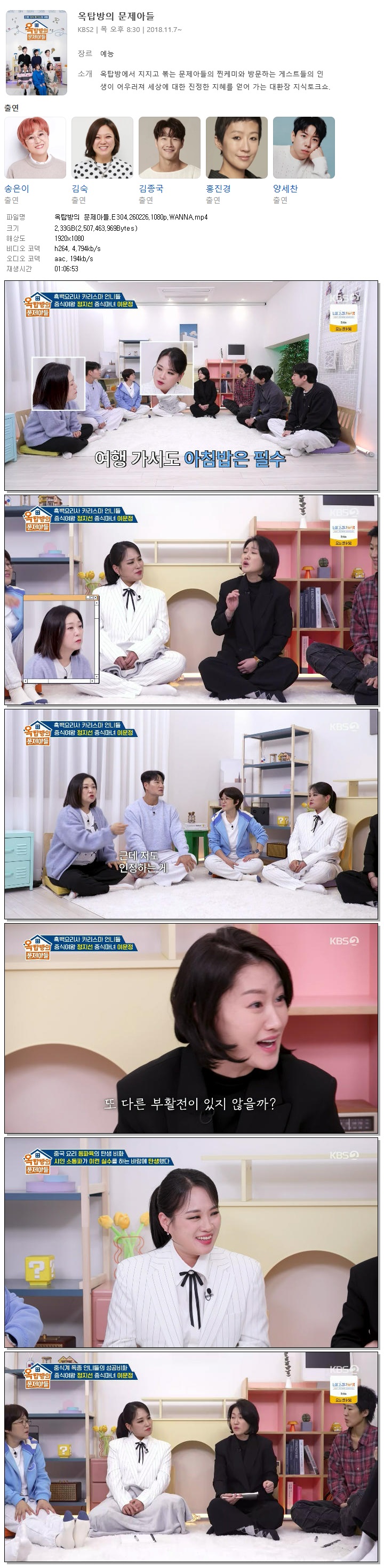 | [KBS2] 옥탑방의 문제아들.E304.260226.1080p.WANNA[정지선, 이문정].mp4 | 2.3 G | 01:06:53 | 1920x1080 |