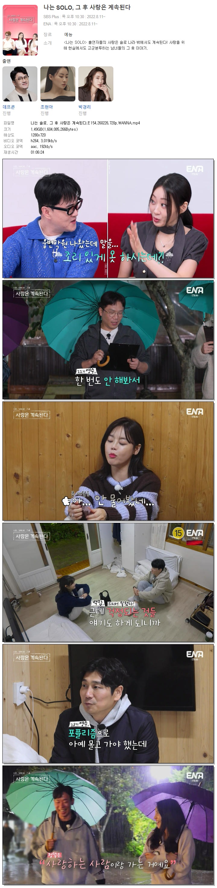 | [ENA] 나는 솔로, 그 후 사랑은 계속된다.E154.260226.720p.WANNA[경리, 보미].mp4 | 1.5 G | 01:06:24 | 1280x720 |