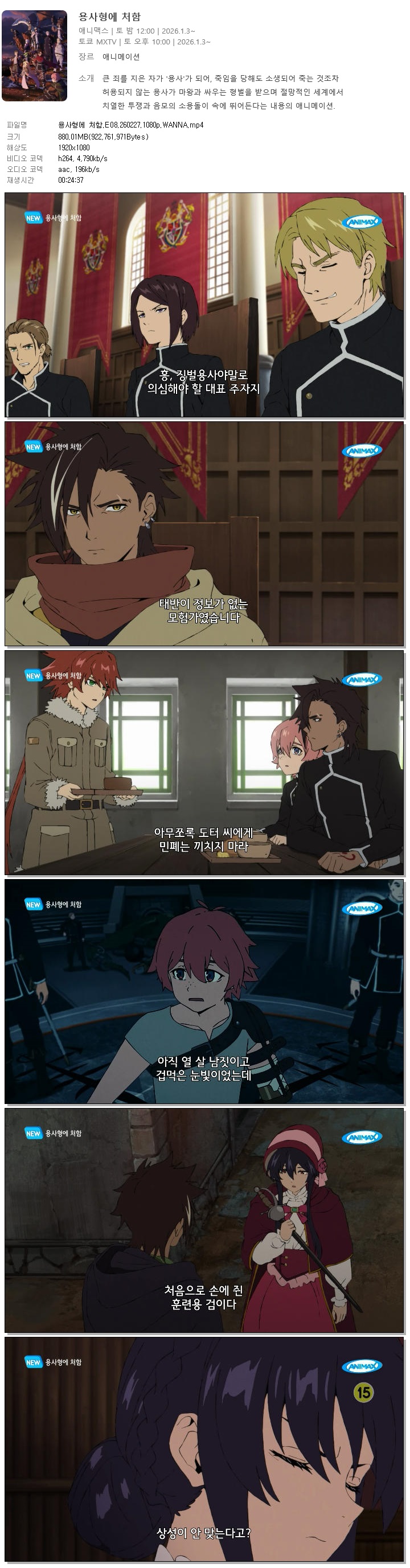 | 용사형에 처함.E08.260227.1080p.WANNA.mp4 | 880 M | 00:24:37 | 1920x1080 |