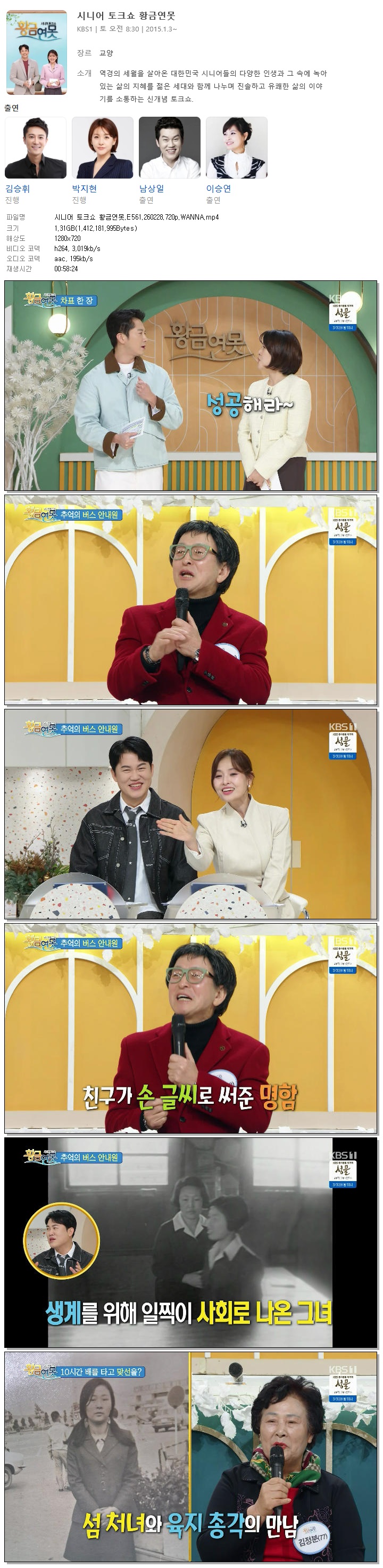 [KBS1] 시니어 토크쇼 황금연못.E561.260228.720p.WANNA[김승휘, 박지현].mp4 1.3 G 00:58:24 1280x720