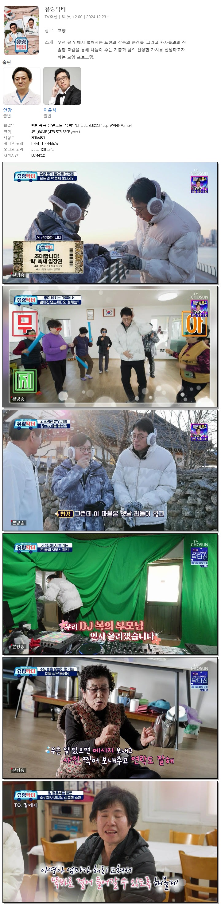 | [TV조선] 방방곡곡 낭만로드 유랑닥터.E50.260228.450p.WANNA[안강, 이윤석].mp4 | 451.6 M | 00:44:22 | 800x450 |