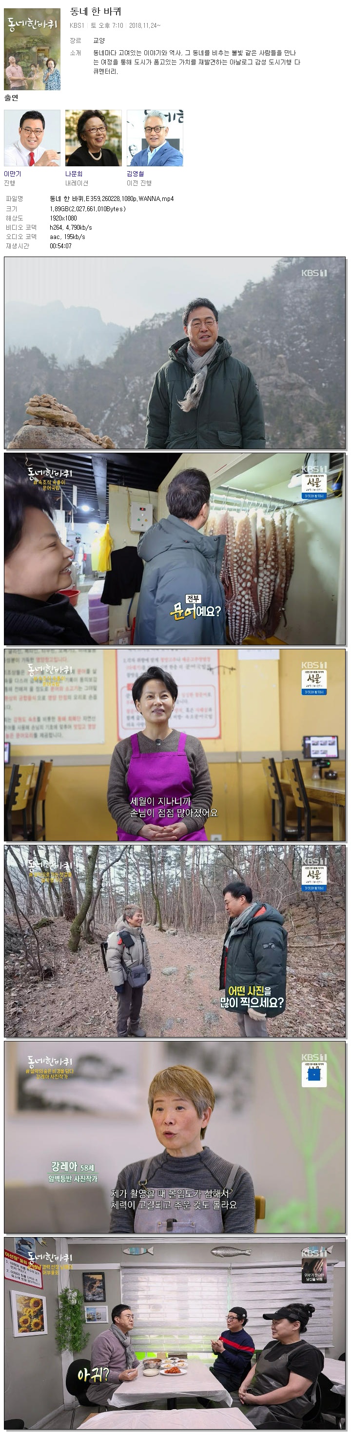 [KBS1] 동네 한 바퀴.E359.260228.1080p.WANNA[이만기].mp4 1.9 G 00:54:07 1920x1080