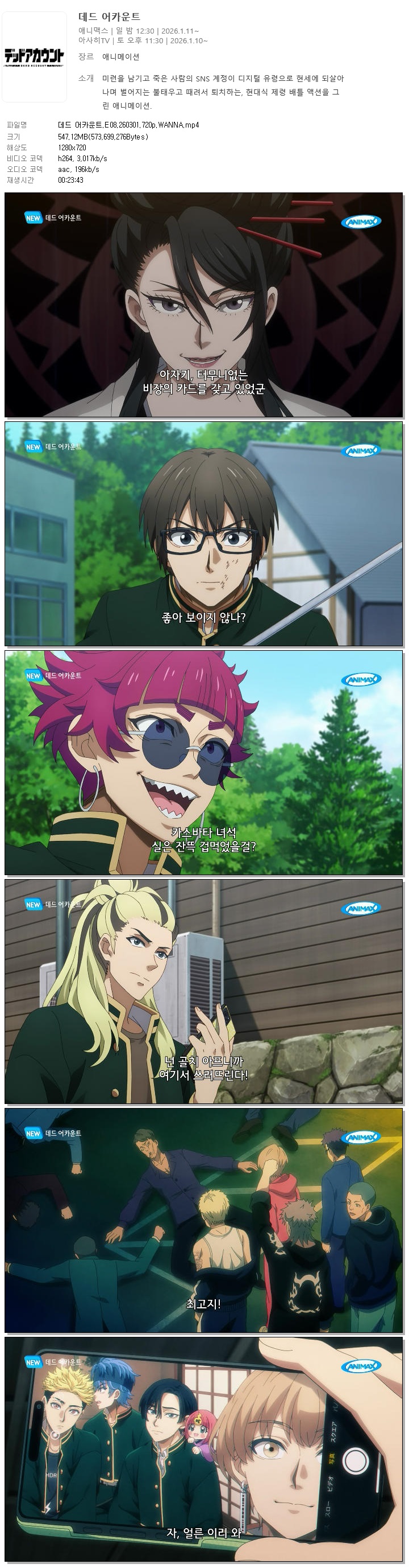 | 데드 어카운트.E08.260301.720p.WANNA.mp4 | 547.1 M | 00:23:43 | 1280x720 |