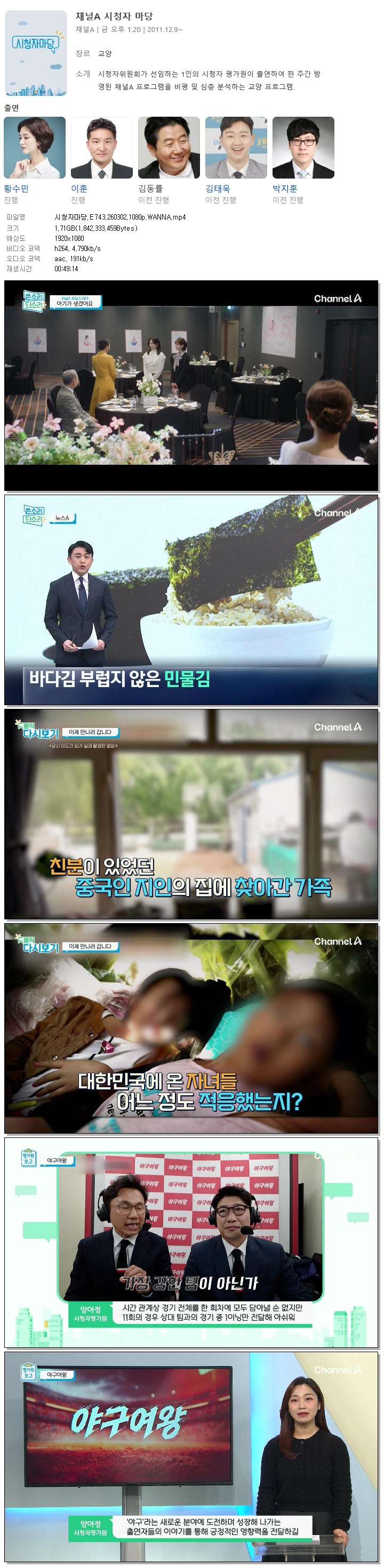 | [채널A] 시청자마당.E743.260302.1080p.WANNA[황수민, 이훈].mp4 | 1.7 G | 00:49:14 | 1920x1080 |