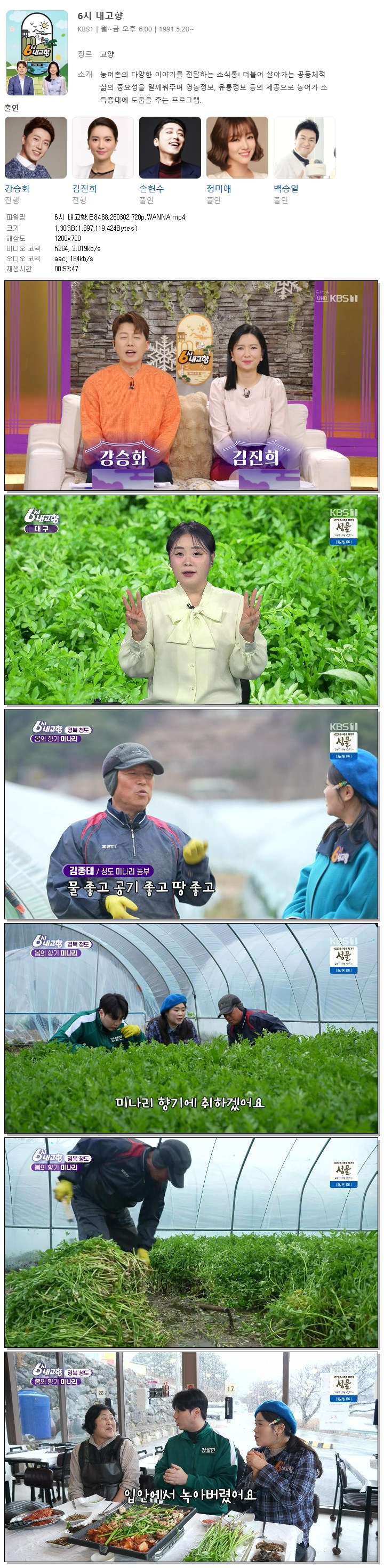| [KBS1] 6시 내고향.E8488.260302.720p.WANNA[강승화, 김진희].mp4 | 1.3 G | 00:57:47 | 1280x720 |