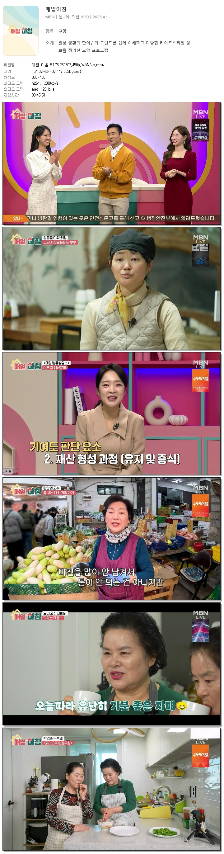 | [MBN] 매일 아침.E173.260303.450p.WANNA[한혜원, 이정수].mp4 | 464.9 M | 00:45:51 | 800x450 |