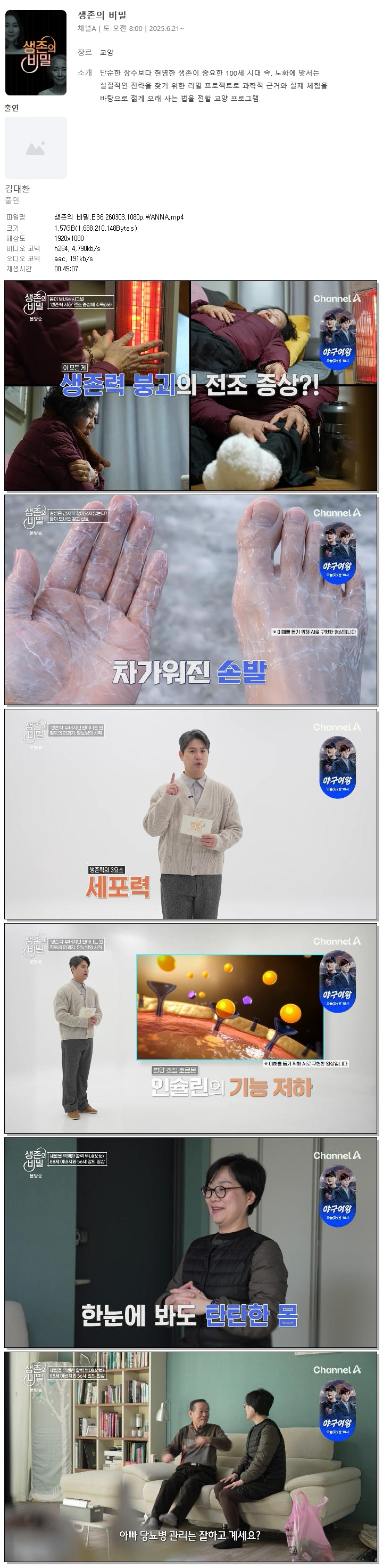 | [채널A] 생존의 비밀.E36.260303.1080p.WANNA[김대환].mp4 | 1.6 G | 00:45:07 | 1920x1080 |