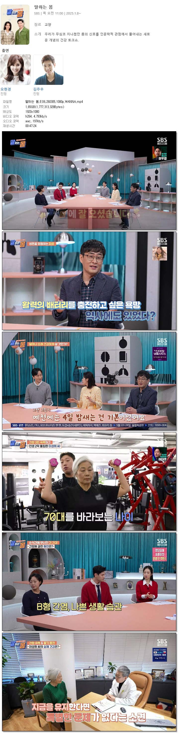 | [SBS] 말하는 몸.E06.260305.1080p.WANNA[오현경, 김주우].mp4 | 1.7 G | 00:47:24 | 1920x1080 |