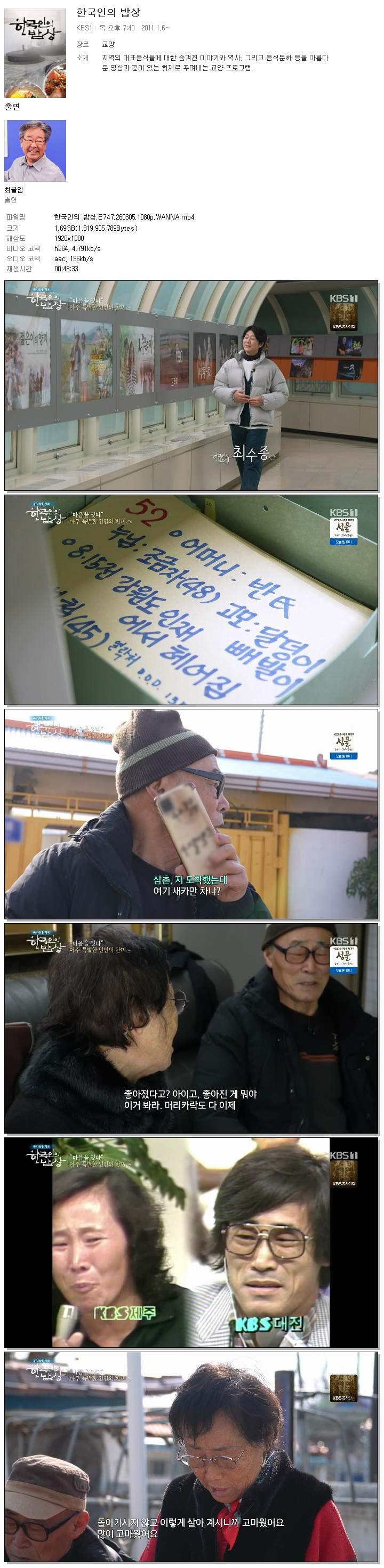 | [KBS1] 한국인의 밥상.E747.260305.1080p.WANNA.mp4 | 1.7 G | 00:48:33 | 1920x1080 |