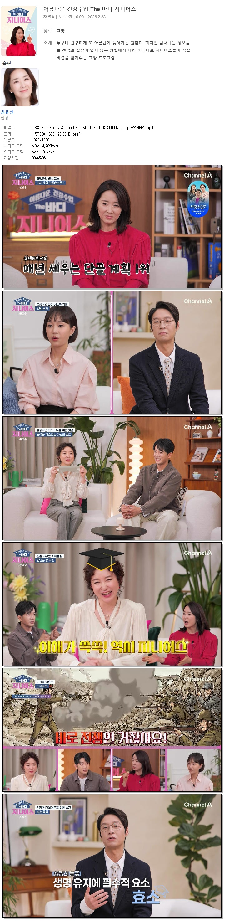 | [채널A] 아름다운 건강수업 The 바디 지니어스.E02.260307.1080p.WANNA[윤유선].mp4 | 1.6 G | 00:45:08 | 1920x1080 |