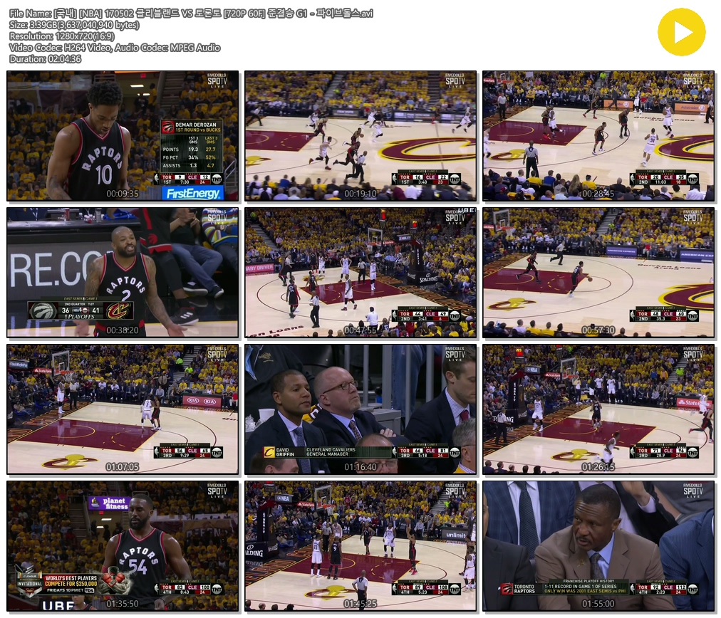 [국내] [NBA] 170502 클리블랜드 VS 토론토 [720P 60F] 준결승 G1 - 파이브돌스.avi 3.4 G 02:04:36 1280x720