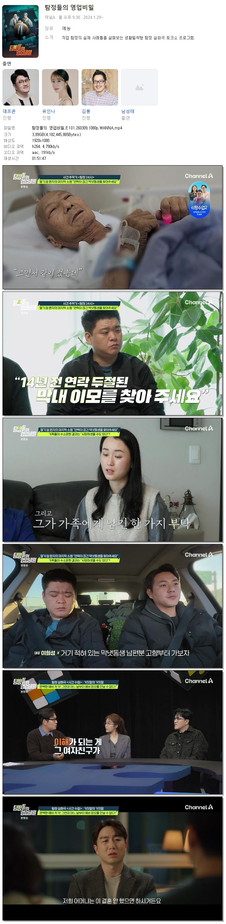 | [채널A] 탐정들의 영업비밀.E101.260309.1080p.WANNA[오존].mp4 | 3.9 G | 01:51:47 | 1920x1080 |