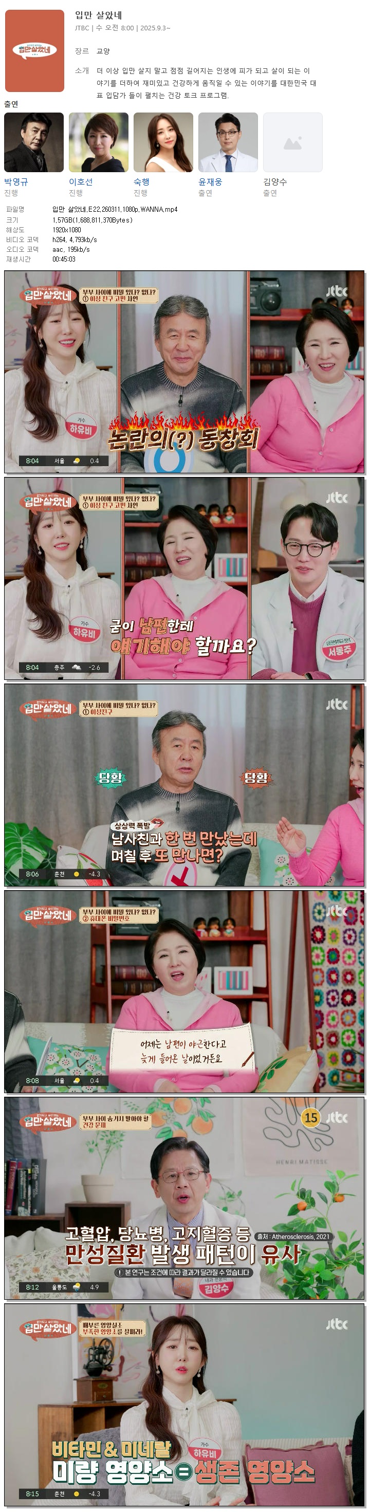 | [JTBC] 입만 살았네.E22.260311.1080p.WANNA[박영규, 이호선].mp4 | 1.6 G | 00:45:03 | 1920x1080 |