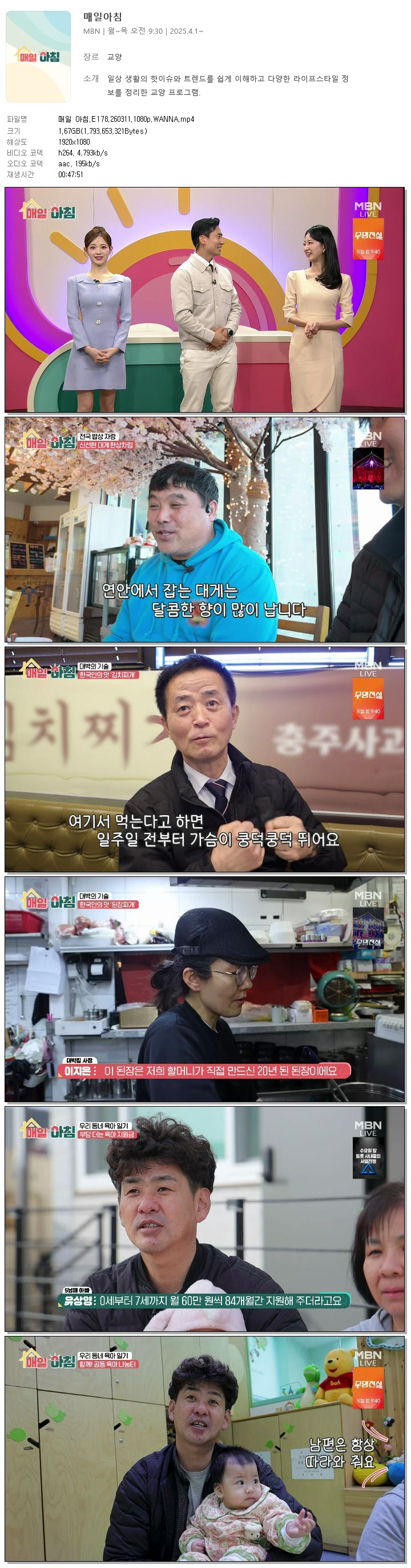 | [MBN] 매일 아침.E178.260311.1080p.WANNA[한혜원, 이정수].mp4 | 1.7 G | 00:47:51 | 1920x1080 |