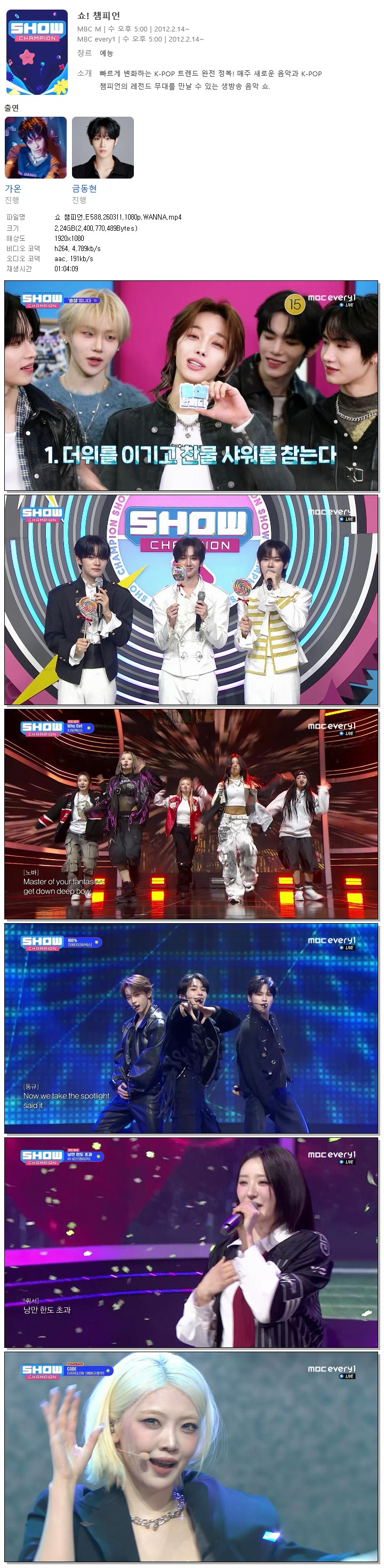 | [MBC Every1] 쇼 챔피언.E588.260311.1080p.WANNA[에버글로우, 메이딘].mp4 | 2.2 G | 01:04:09 | 1920x1080 |