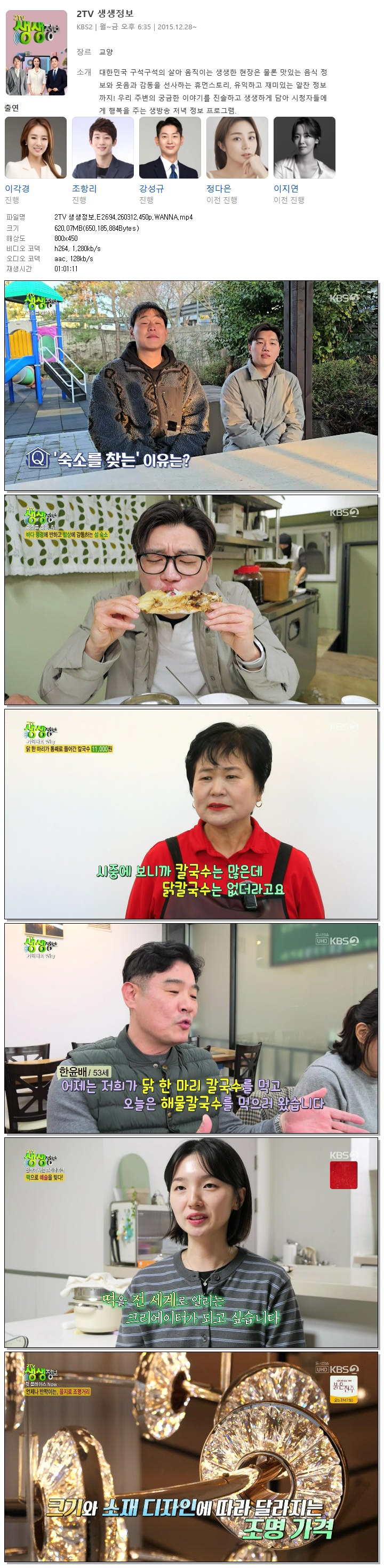 | [KBS2] 2TV 생생정보.E2694.260312.450p.WANNA[이각경, 조항리].mp4 | 620.1 M | 01:01:11 | 800x450 |