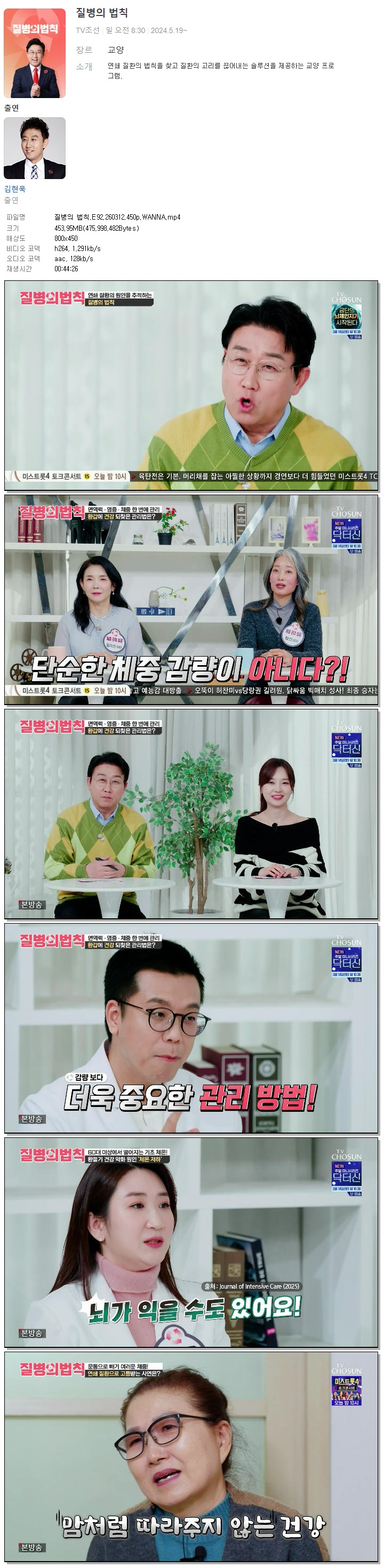 | [TV조선] 질병의 법칙.E92.260312.450p.WANNA[김현욱].mp4 | 453.9 M | 00:44:26 | 800x450 |