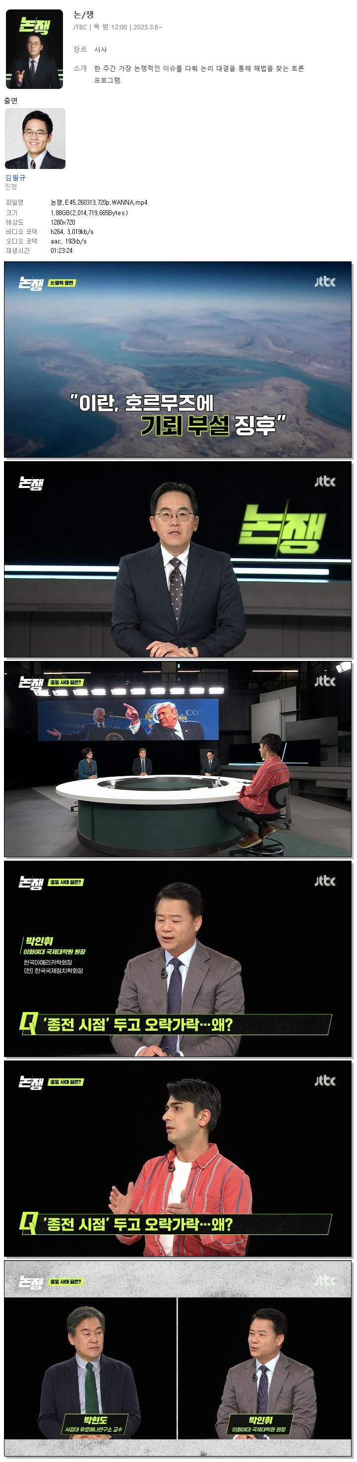 | [JTBC] 논쟁.E45.260313.720p.WANNA[김필규].mp4 | 1.9 G | 01:23:24 | 1280x720 |