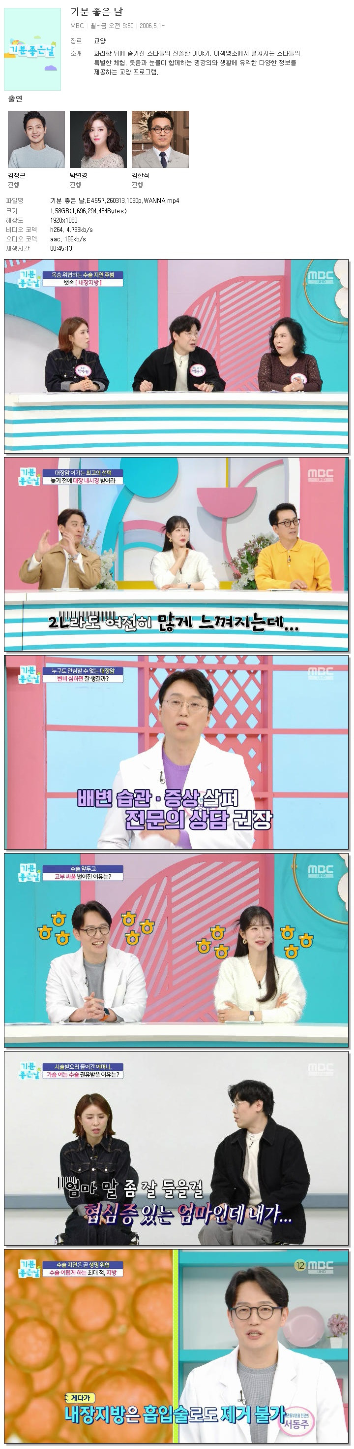 | [MBC] 기분 좋은 날.E4557.260313.1080p.WANNA[서인, 박연경].mp4 | 1.6 G | 00:45:13 | 1920x1080 |