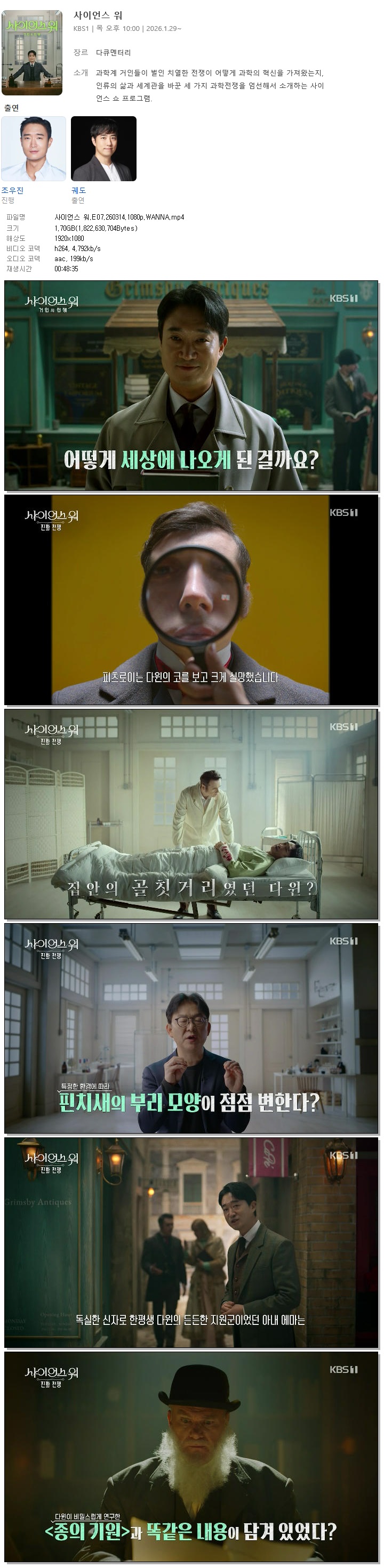 과학은 언제나 하나의 질문에서 시작됐다. 오늘날 우리가 누리는 과학기술과 문명의 진보 뒤에는 집요한 질문과 수많은 가설, 반증과 실패를 거듭한 과학계 거인들의 치열한 전쟁이 있었다. 관전 포인트 ① 조우진 X 궤도, 과학을 ‘이야기’로 풀어내는 최적의 조합 믿고 보는 명품 배우 조우진과 이 시대 가장 주목받는 과학 커뮤니케이터 궤도의 만남. 이 조합만으로도 1회부터 화제를 모았던 '사이언스 워:거인의 전쟁'이 이번엔 ‘생명의 미스터리’ 속으로 들어간다. 무대는 1950년대, 생명의 비밀을 두고 과학자들이 숨 막히는 레이스를 벌였던 현장이다. 조우진은 주요 인물들 사이를 오가며 야망과 집착, 그리고 과학적 신념이 교차하던 과학 전쟁의 순간을 연극적 호흡과 섬세한 감정 연기로 풀어낸다. 천의 얼굴, 조우진의 연기는 어려운 과학을 감정과 서사가 살아있는 ‘사람 이야기’로 바꿔놓는다. 여기에 궤도의 명쾌한 설명이 더해지며 시청자는 복잡한 과학 이론을 자연스럽게 이해하게 된다. 관전 포인트 ② 초대형 세트 ‘여섯 개의 방’, 시공간을 넘나드는 과학 드라마 '사이언스 워'는 초대형 스튜디오에 구현된 여섯 개의 공간을 무대로 과학사의 결정적 순간들을 입체적으로 재현한다. 기존 교양 프로그램에서 보기 힘들었던 화려한 세트, 정교하게 설계된 카메라 동선, 영화적 조명과 음악이 어우러지며 강렬한 시청각적 몰입을 선사한다. 공영방송 KBS가 축적한 다큐 제작 노하우에 연극적 무대를 결합한 새로운 과학 프로그램의 탄생. 과학 이론의 충돌과 그 끝에 탄생한 결정적 순간들이 마치 한 편의 영화처럼 눈앞에 펼쳐친다. 관전포인트 ③ ‘어렵지 않지만, 얕지 않은’ 과학 스토리텔링 재미와 지적 유희를 동시에 충족시키는 지식 콘텐츠가 넘쳐나는 시대. 하지만 질문의 ‘맥락’까지 짚어주는 프로그램은 드물다. '사이언스 워:거인의 전쟁'은 이 지점에서 출발한다. 과학을 단순히 ‘쉽고, 재밌게’ 설명하는 데서 멈추지 않고 왜 그 질문이 시작됐고, 어떻게 이어져 왔는지를 이야기로 풀어낸다. 생명의 궁금증에서 출발한 질문은 멘델과 슈뢰딩거를 거쳐 DNA 구조 발견이라는 결정적 순간에 이르고, 시청자는 과학자들의 치열한 이론 전쟁이 왜 중요했는지 그리고 오늘날 우리의 삶과 어떻게 연결되는지를 알게 된다.과학이 처음인 시청자부터 익숙한 시청자까지 모두가 즐길 수 있는 과학 스토리텔링이 강점이다. * 사이언스워는 한국과학창의재단의 ‘2025년 과학프로그램 지원사업’ 선정작이다 '사이언스 워:거인의 전쟁' 2회 – DNA 전쟁 : 왓슨과 크릭 ■ 과학계의 문제아 제임스 왓슨 타계, 재조명되는 DNA 구조 발견 지난해 11월 6일 제임스 왓슨 (향년 97세)의 타계 소식과 함께 그의 업적이 재조명되고 있다. 제임스 왓슨과 프랜시스 크릭이 1953년 발표한 128줄짜리 단 한 장의 논문은 과학사의 흐름을 바꿔 놓았다. 하지만 그 순간에 이르기까지, 인류는 오랫동안 ‘생명이란 무엇인가’, ‘부모의 특징은 어떻게 다음 세대로 전해지는가?’라는 질문 앞에서 답을 찾지 못했다. 당시 이름조차 알려지지 않았던 젊은 풋내기 과학자 왓슨과 크릭은 어떻게 가장 먼저 생명의 설계도를 손에 넣을 수 있었을까? '사이언스 워:거인의 전쟁' 두 번째, 생명의 비밀에 도전한 과학자들의 치열한 전쟁의 서막이 오른다. ■ 풀리지 않는 미스터리 ‘생명이란 무엇인가’ 20세기 중반, 과학의 중심은 흔들리고 있었다. 세계대전과 경제 대공황을 겪으며 물리학자들은 과학이 인류를 구하지 못했다는 깊은 회의에 빠진다. 그때, 한 물리학자가 던진 질문이 과학계를 뒤흔든다. ‘생명이란 무엇인가’. 슈뢰딩거의 이 질문은 생명을 물리 화학의 언어로 풀 수 있다는 도발적인 가능성을 제시했고, 방황하던 젊은 과학자들은 생물학이라는 미지의 영역으로 향한다. 19세기 멘델이 유전학의 문을 열고, 20세기 초 모건이 초파리 실험으로 유전 정보가 염색체에 있다는 사실을 밝혀낸 뒤, 과학자들은 마침내 유전물질의 주인공이 DNA라는 사실에 도달한다. 그러나 그들 앞에는 또 다른 난제가 남는다. ‘DNA는 어떤 구조로 생명 정보를 담고 있는가?’ ■ DNA 구조를 둘러싼 사상 초유의 과학 레이스 1950년대, DNA 구조를 밝히기 위해 과학자들은 한 치의 양보도 없는 레이스에 돌입한다. 화학계의 거장 라이너스 폴링, X선 회절 분야의 최고 실력자 로절린드 프랭클린과 모리스 윌킨스, 그리고 이름조차 널리 알려지지 않았던 젊은 과학자 제임스 왓슨과 프랜시스 크릭. 세 팀의 경쟁이 치열해지는 가운데, 왓슨은 프랭클린이 찍은 ‘포토51’을 보게 된다. 그리고 이 한 장의 사진은 그들의 운명을 완전히 바꿔놓는다. ■ 구조 발견 이후, 또 다른 전쟁 ‘게놈 프로젝트’ 왓슨과 크릭은 DNA 이중나선 구조를 밝혀내며 과학사의 승자로 기록된다. 그러나 이 위대한 발견 뒤에는 끝내 정리되지 않은 논쟁이 남아있다. 결정적 단서를 제공한 로절린드 프랭클린은 왜 노벨상의 주인공이 되지 못했는가? 그녀의 공은 어디까지 인정받아야 하는가 이 질문은 오늘날까지 미완으로 남아있다. DNA 구조 발견 이후, 인류는 멈추지 않