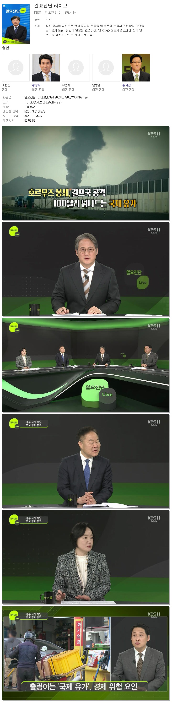 | [KBS1] 일요진단 라이브.E324.260315.720p.WANNA[김대홍].mp4 | 1.3 G | 00:58:05 | 1280x720 |