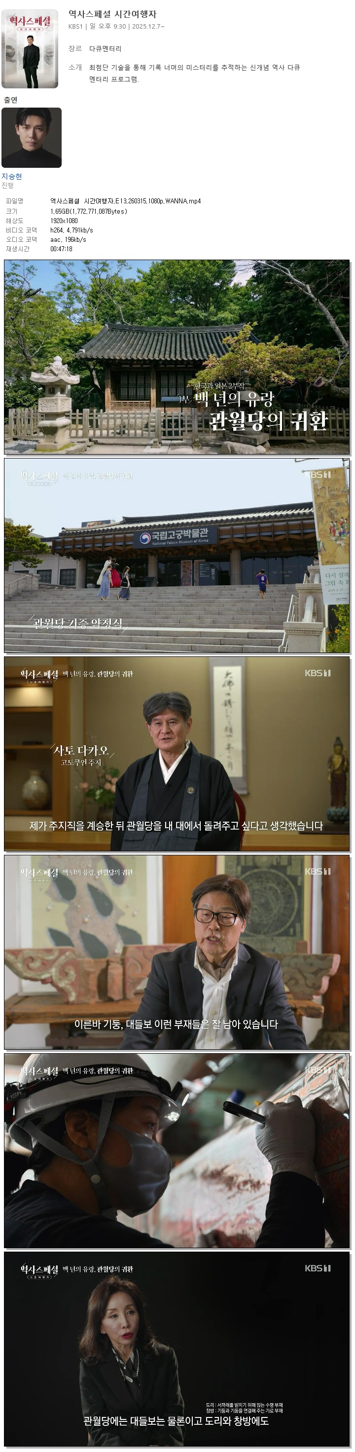 | [KBS1] 역사스페셜 시간여행자.E13.260315.1080p.WANNA[지승현].mp4 | 1.7 G | 00:47:18 | 1920x1080 |