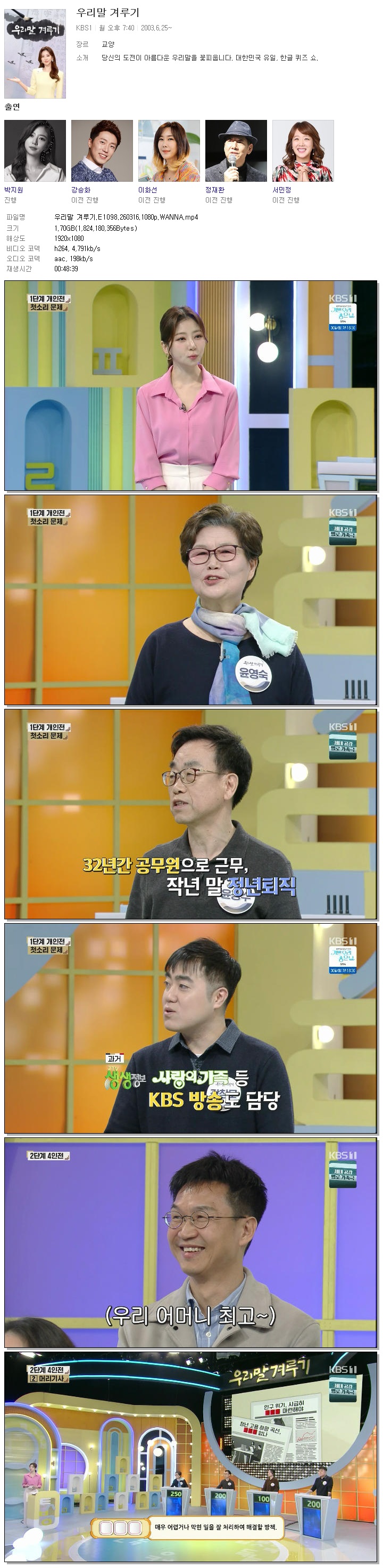| [KBS1] 우리말 겨루기.E1098.260316.1080p.WANNA[박지원].mp4 | 1.7 G | 00:48:39 | 1920x1080 |