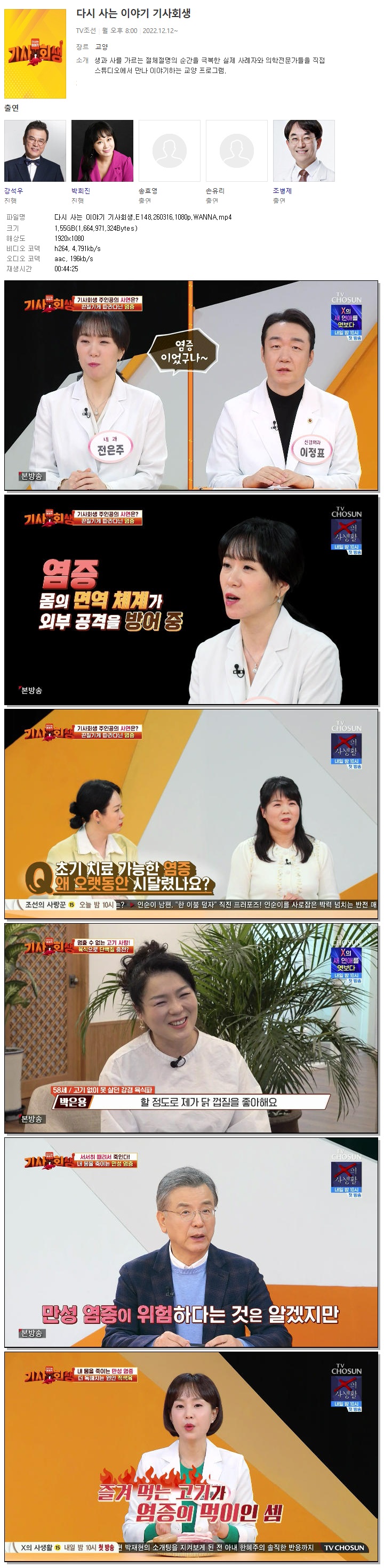 | [TV조선] 다시 사는 이야기 기사회생.E148.260316.1080p.WANNA[강석우, 박희진].mp4 | 1.6 G | 00:44:25 | 1920x1080 |