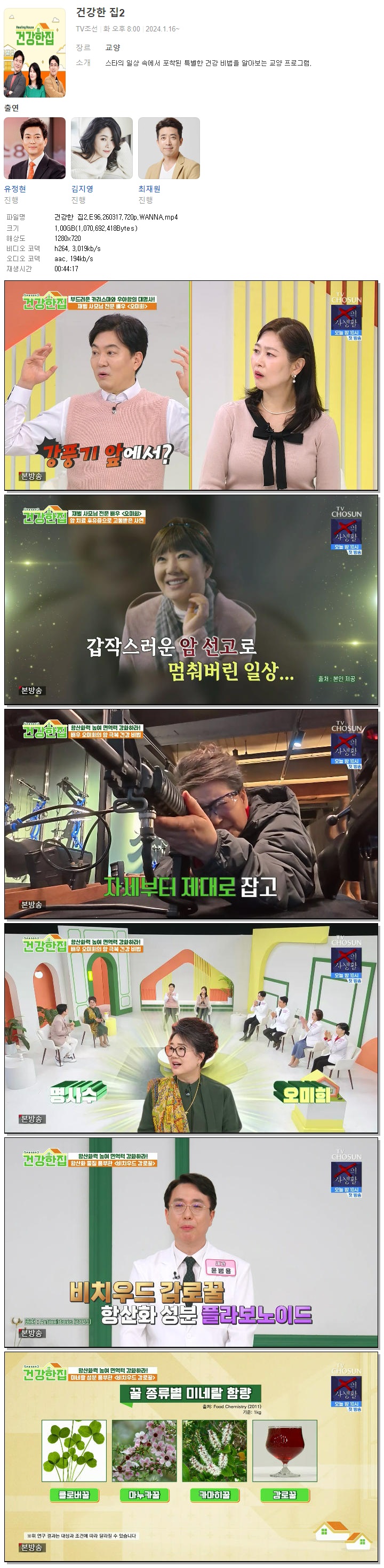 | [TV조선] 건강한 집2.E96.260317.720p.WANNA[유정현, 김지영].mp4 | 1021.1 M | 00:44:17 | 1280x720 |