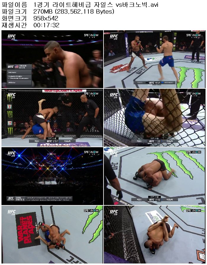 | 1경기 라이트헤비급 자일스 vs바크노빅.avi | 270.4 M | 00:17:32 | 958x542 |