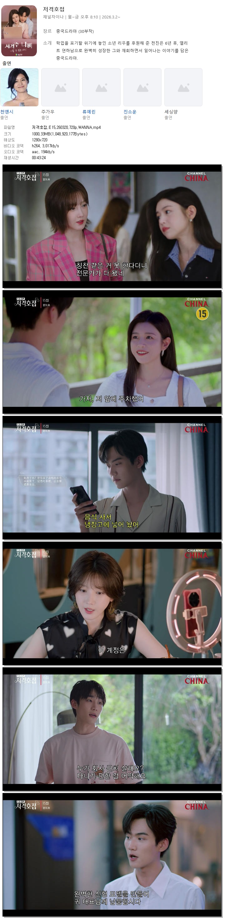 | [채널차이나] 저격호접.E15.260320.720p.WANNA[천옌시, 주가우].mp4 | 1000.3 M | 00:43:24 | 1280x720 |