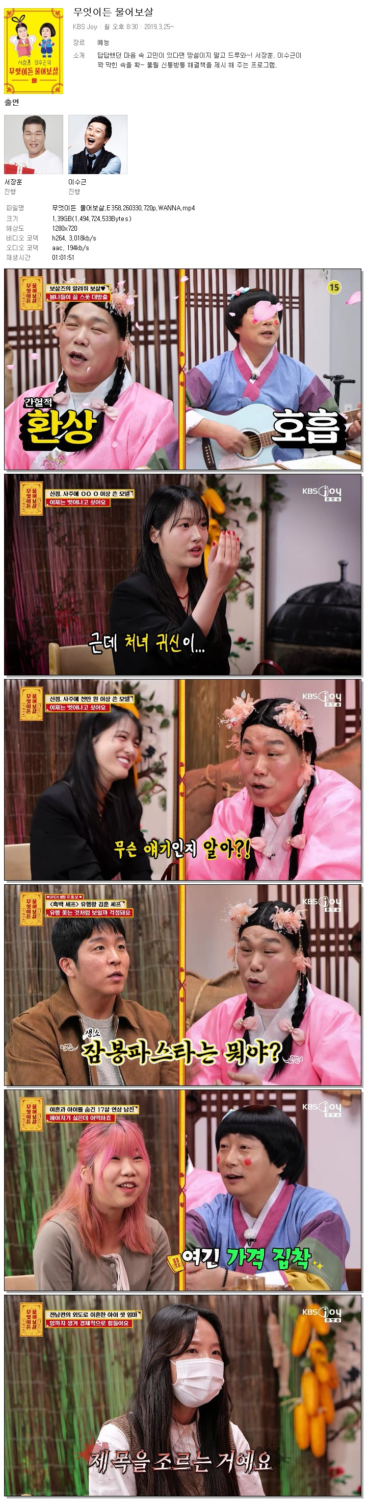 | [KBS JOY] 무엇이든 물어보살.E358.260330.720p.WANNA[서장훈, 이수근].mp4 | 1.4 G | 01:01:51 | 1280x720 |