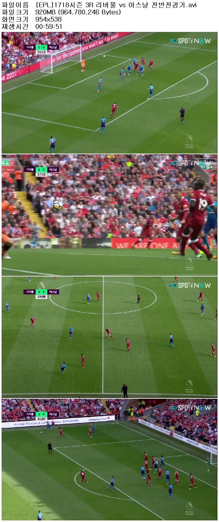 | [EPL]1718시즌 3R 리버풀 vs 아스날 전반전경기.avi | 920.1 M | 00:59:51 | 954x538 |