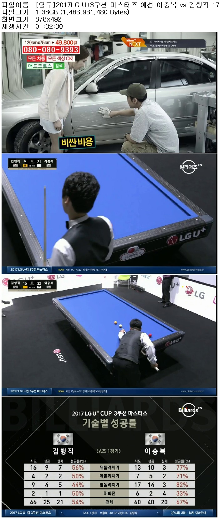 | [당구]2017LG U+3쿠션 마스터즈 예선 이충복 vs 김행직 170905.avi | 1.4 G | 01:32:30 | 878x492 |