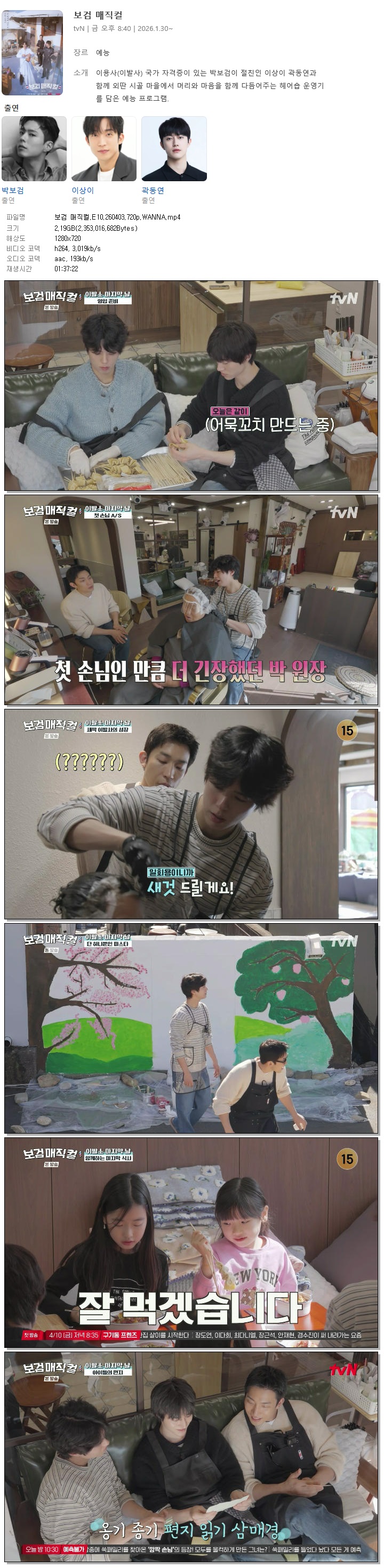 | [TVN] 보검 매직컬.E10.260403.720p.WANNA[박보검, 이상이].mp4 | 2.2 G | 01:37:22 | 1280x720 |