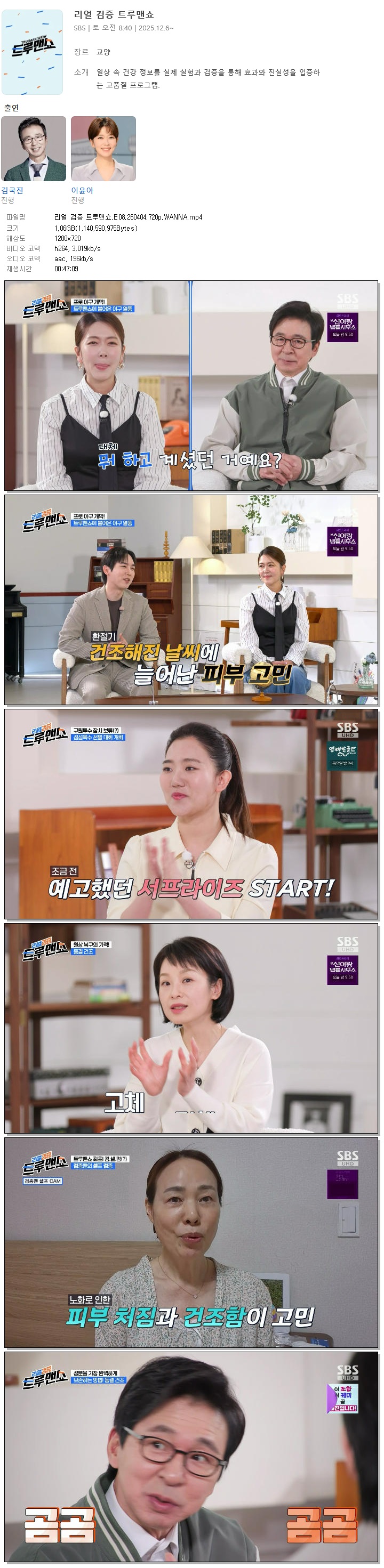 | [SBS] 리얼 검증 트루맨쇼.E08.260404.720p.WANNA[김국진, 이윤아].mp4 | 1.1 G | 00:47:09 | 1280x720 |