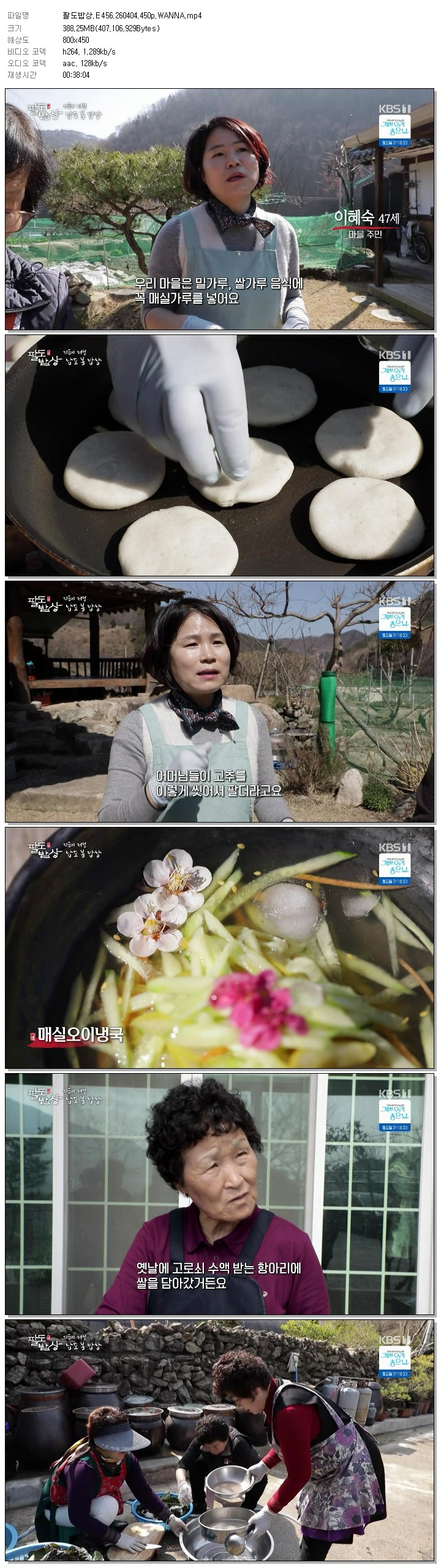 | [KBS1] 팔도밥상.E456.260404.450p.WANNA.mp4 | 388.2 M | 00:38:04 | 800x450 |