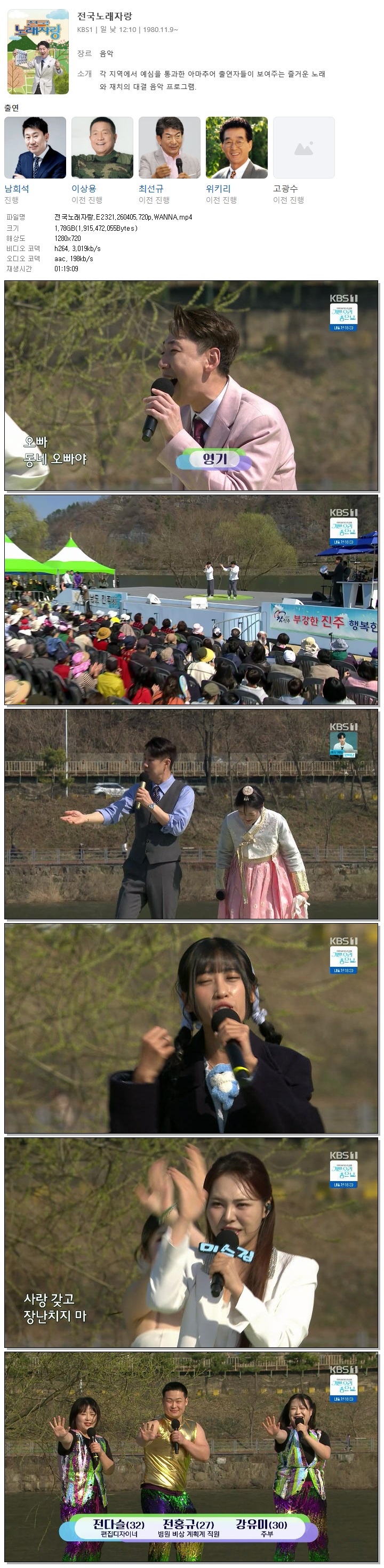[KBS1] 전국노래자랑.E2321.260405.720p.WANNA[남희석].mp4 1.8 G 01:19:09 1280x720