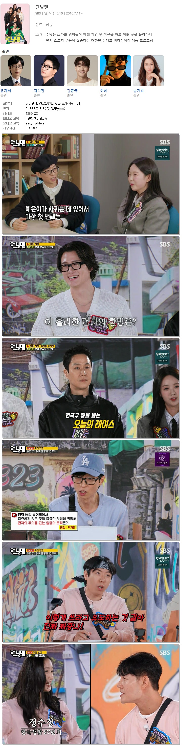 | [SBS] 런닝맨.E797.260405.720p.WANNA[정우, 정수정].mp4 | 2.2 G | 01:35:47 | 1280x720 |