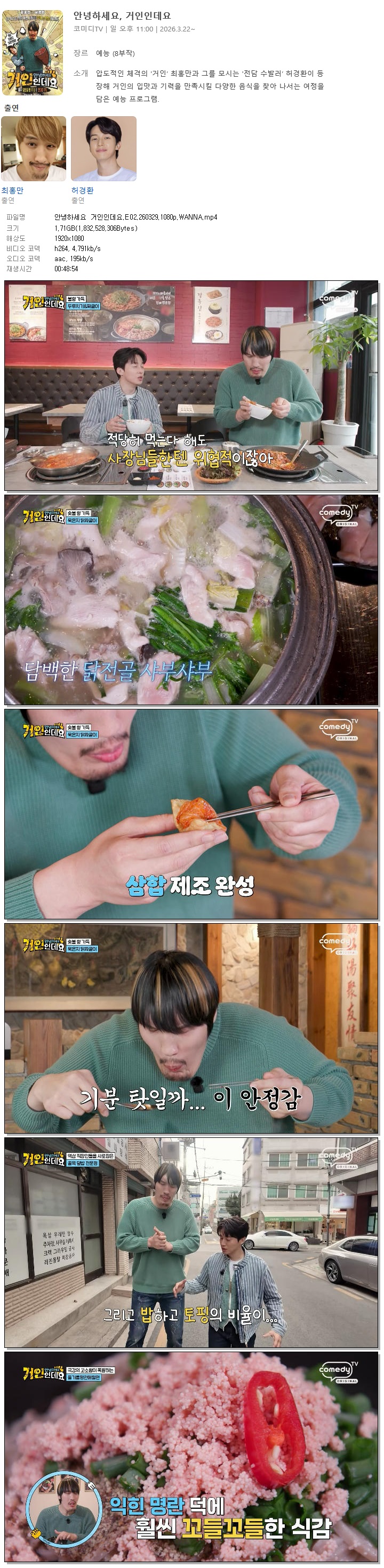 | [코미디TV] 안녕하세요 거인인데요.E02.260329.1080p.WANNA[최홍만, 허경환].mp4 | 1.7 G | 00:48:54 | 1920x1080 |