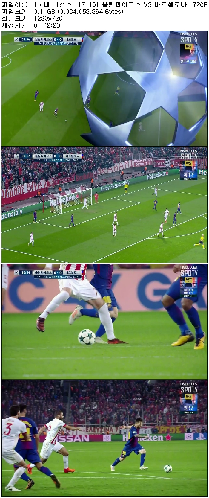 [국내] [챔스] 171101 올림피아코스 VS 바르셀로나 [720P 60F].avi 3.1 G 01:42:23 1280x720