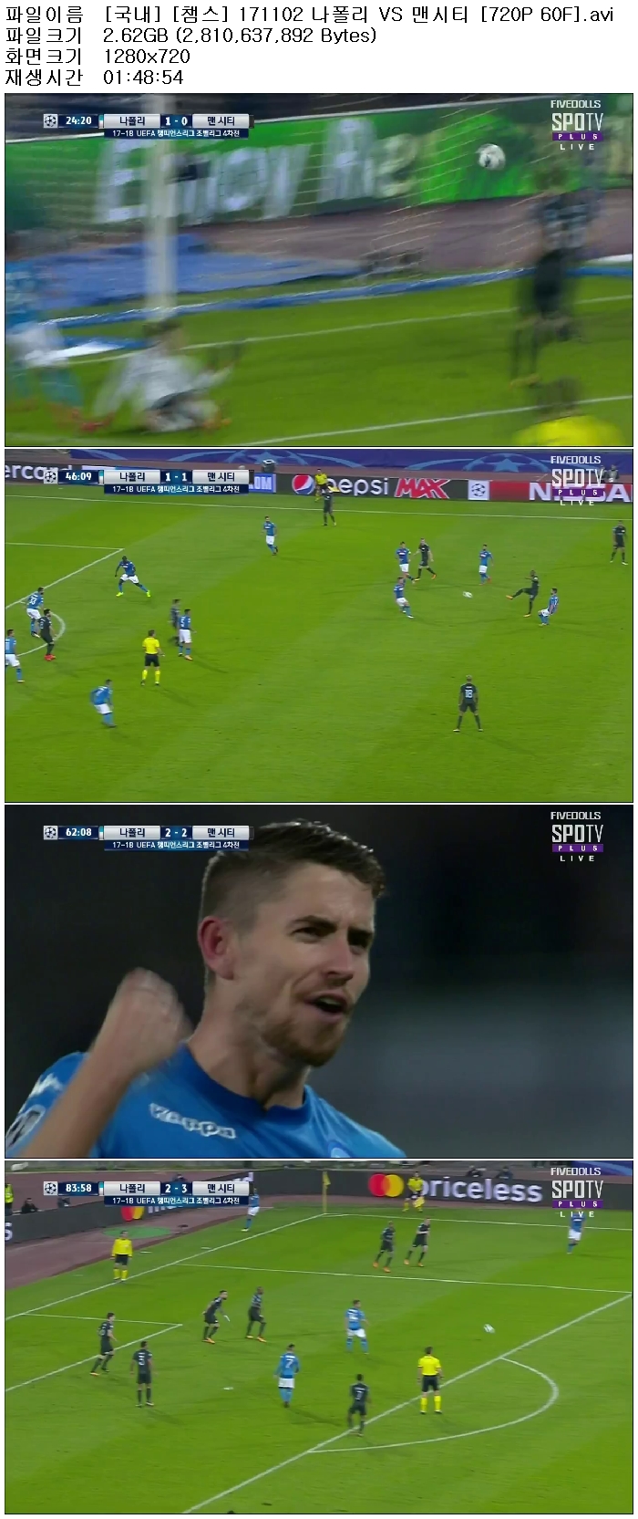 [국내] [챔스] 171102 나폴리 VS 맨시티 [720P 60F].avi 2.6 G 01:48:54 1280x720