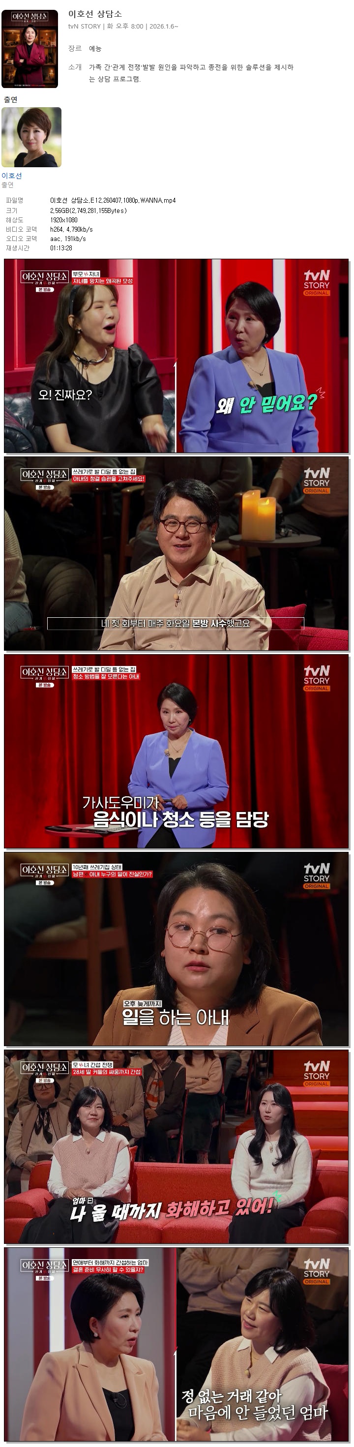 | [TVN STORY] 이호선 상담소.E12.260407.1080p.WANNA[이호선].mp4 | 2.6 G | 01:13:28 | 1920x1080 |