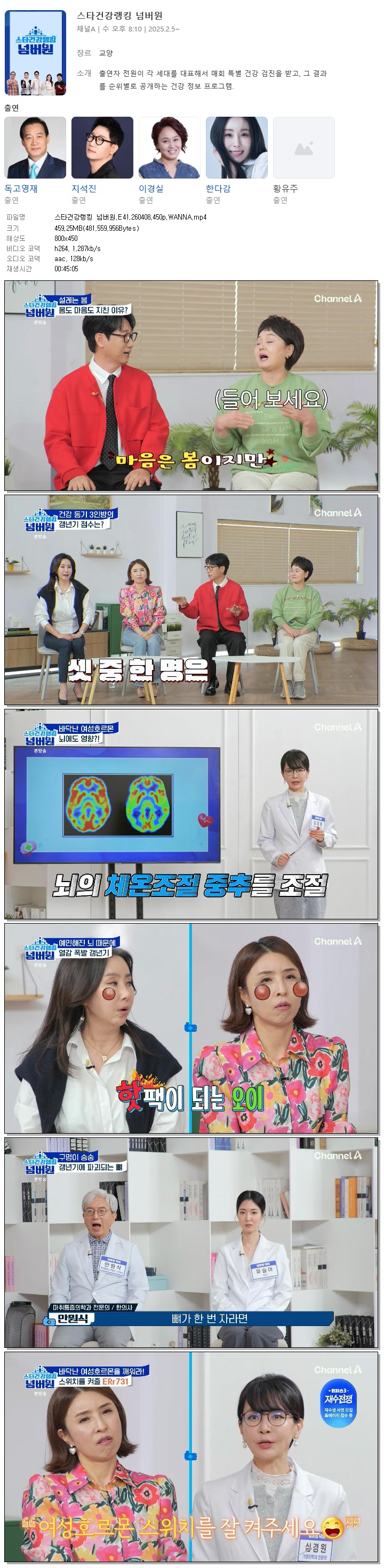 | [채널A] 스타건강랭킹 넘버원.E41.260408.450p.WANNA[지석진, 이세창].mp4 | 459.3 M | 00:45:05 | 800x450 |