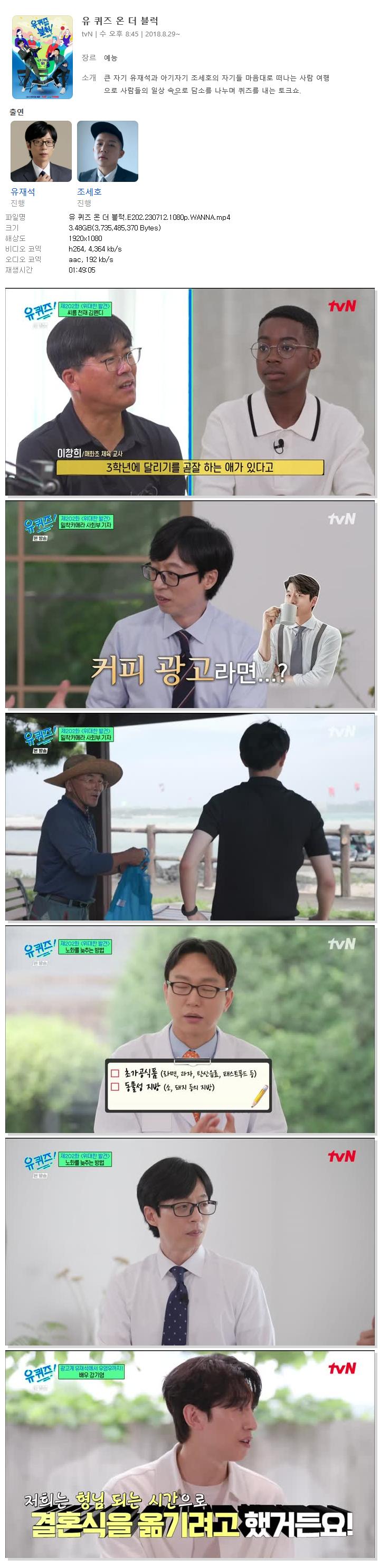 [TVN] 유 퀴즈 온 더 블럭.E202.230712.1080p.WANNA.mp4 3.5 G 01:49:05 1920x1080